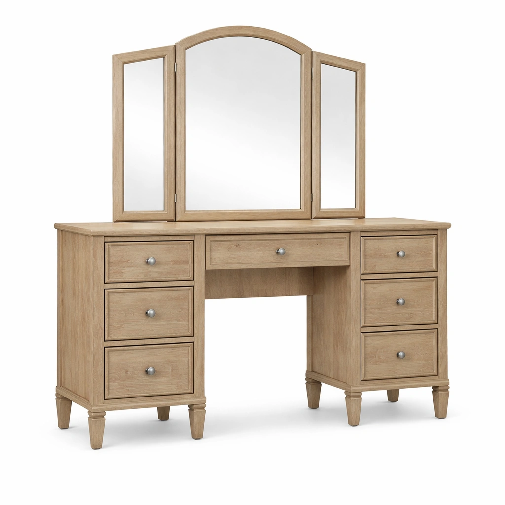 Dieser Frisiertisch verfügt über ein Gestell aus Eichenholz und einen dreiteiligen Klappspiegel aus Spiegelglas. Die Maße betragen 150 cm in der Länge, 40 cm in der Breite und 130 cm in der Höhe. Er hat sieben Schubladen zur Aufbewahrung verschiedener Gegenstände. Die Oberfläche ist geölt.